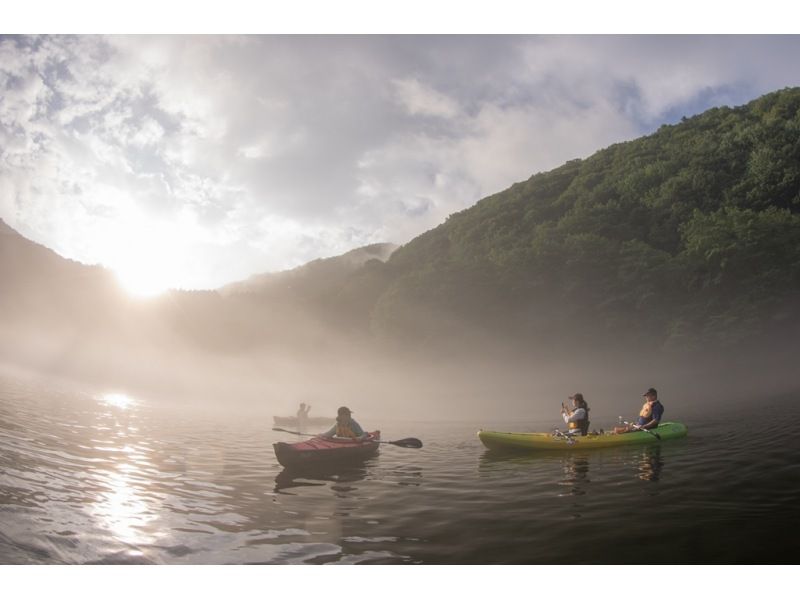 詳細【群馬・吾妻】青い湖・四万湖で癒しの早朝カヌーツアー!1日の始まりを静かな湖で優雅に過ごしましょう♪