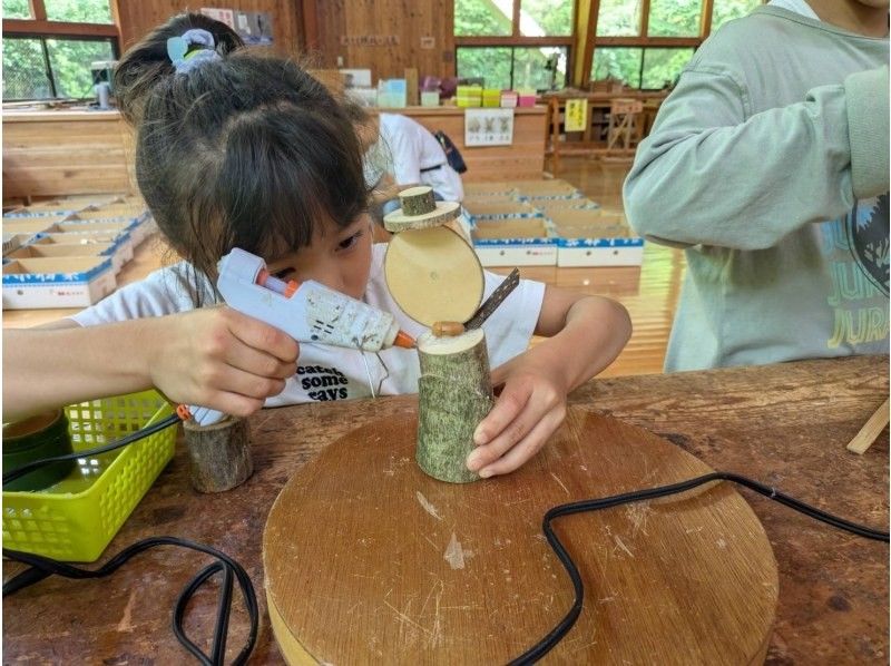 ドングリなどの木の実や様々な形の木片、枝をグルーガンで接着し、お好きなもの作製できます!何を作ったらいいかわからない…という方でも見本品があるのでご心配なく☆作りながら想像を広げていきましょう!