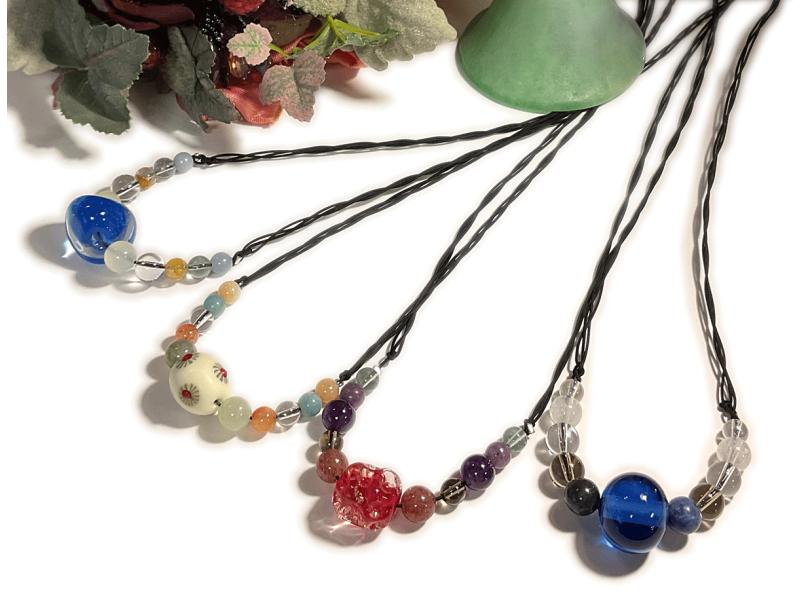 ご自身のイメージでお好きなとんぼ玉と天然石を組み合わせてオリジナルのペンダントをお作りいただけます。色や柄によってカラフルに、可愛く、またはシックにご自身のイメージで楽しく作っていただけます。